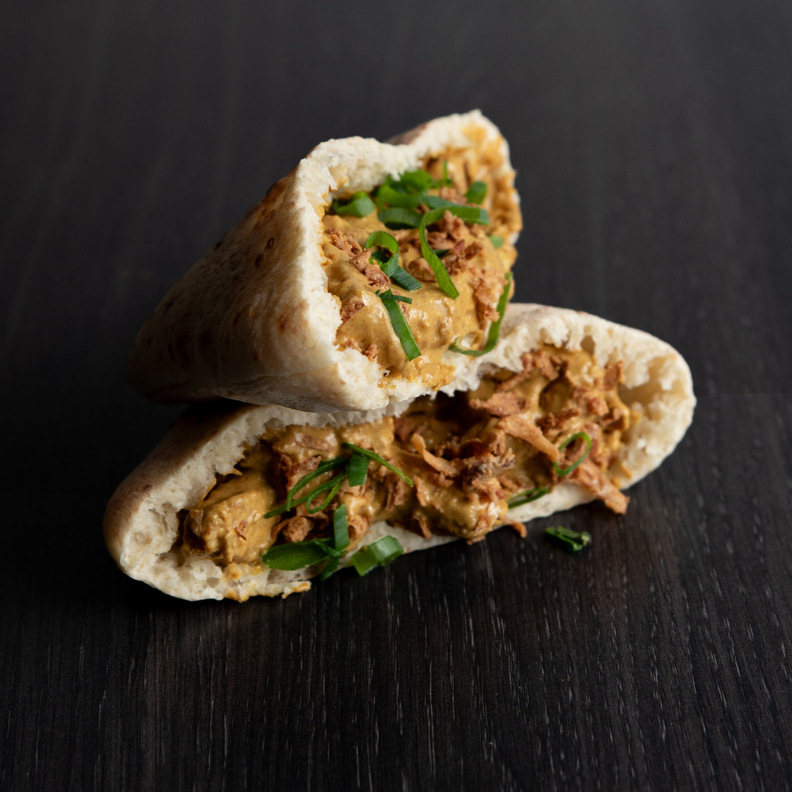 Huisgemaakte hete kip op naan brood met gebakken ui en bosui.